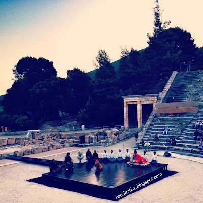 Ξημέρωμα στο θέατρο Επιδαύρου με τις πρώτες ακτίνες του ήλιου να αγκαλιάζουν την πλάση, παράλληλα με ένα τελετουργικό κάλεσμα στον ήλιο, που πραγματοποίησε ο μεγάλος γιαπωνέζος δάσκαλος Rokuro Gensho Umewaka, ακολουθώντας μια παλαιά τελετουργία του ΝΟ.