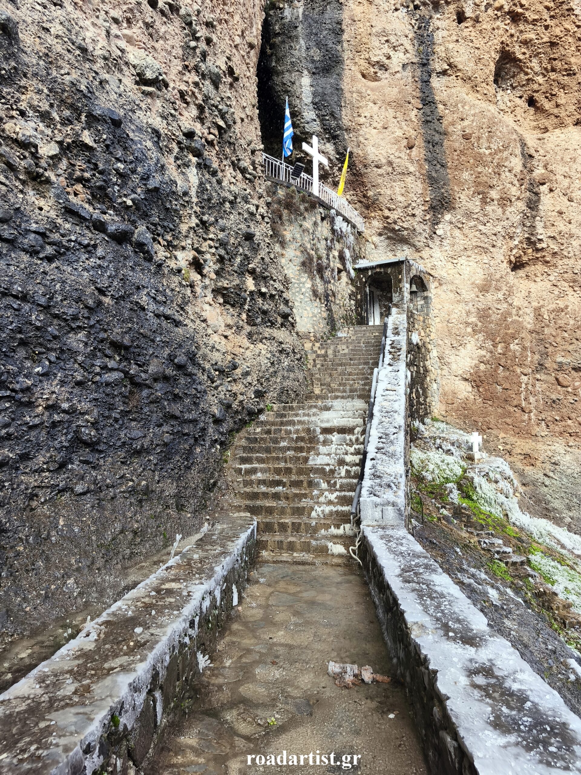 Καθώς σκύβεις και μπαίνεις στην είσοδο της εκκλησίας, βλέπεις στην άκρη μέσα από το βράχο να τρέχει νερό, αγίασμα δροσερό και ιαματικό συνδεδεμένο με την αγιότητα του τόπου. Πίνεις λίγο, βάζεις και στο μπουκαλάκι σου και σκέφτεσαι ότι εδώ τα πιο σημαντικά είναι απλόχερα δωρεάν χαρισμένα.